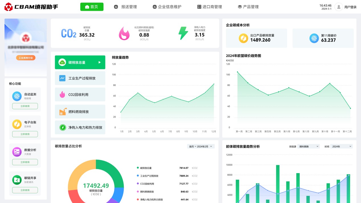 2023年10月1日起,歐盟碳邊境調整機制(CBAM)已進入過渡期,CBAM涵蓋范圍的出口產(chǎn)品需按時提交產(chǎn)品碳排放報告,未提交報告的企業(yè)將面臨高額處罰。為解決企業(yè)由于官方政策文件理解難度大,專業(yè)門檻高,數(shù)據(jù)搜集難度大,部分數(shù)據(jù)缺失無法填等困擾,推出碳關稅管理平臺(CBAM填報助手),通過數(shù)字化方式,為企業(yè)提供碳數(shù)據(jù)填報、碳數(shù)據(jù)核算、碳數(shù)據(jù)報送、碳數(shù)據(jù)認證、咨詢培訓等全流程服務。可極大減少企業(yè)碳排放報送門檻,助力企業(yè)低成本合規(guī)報送碳排放數(shù)據(jù)。